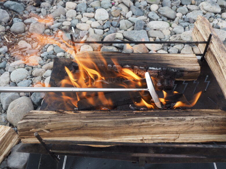 そして、熊手を使って火中の薪の移動、焚火が終われば灰を集めるのに便利。